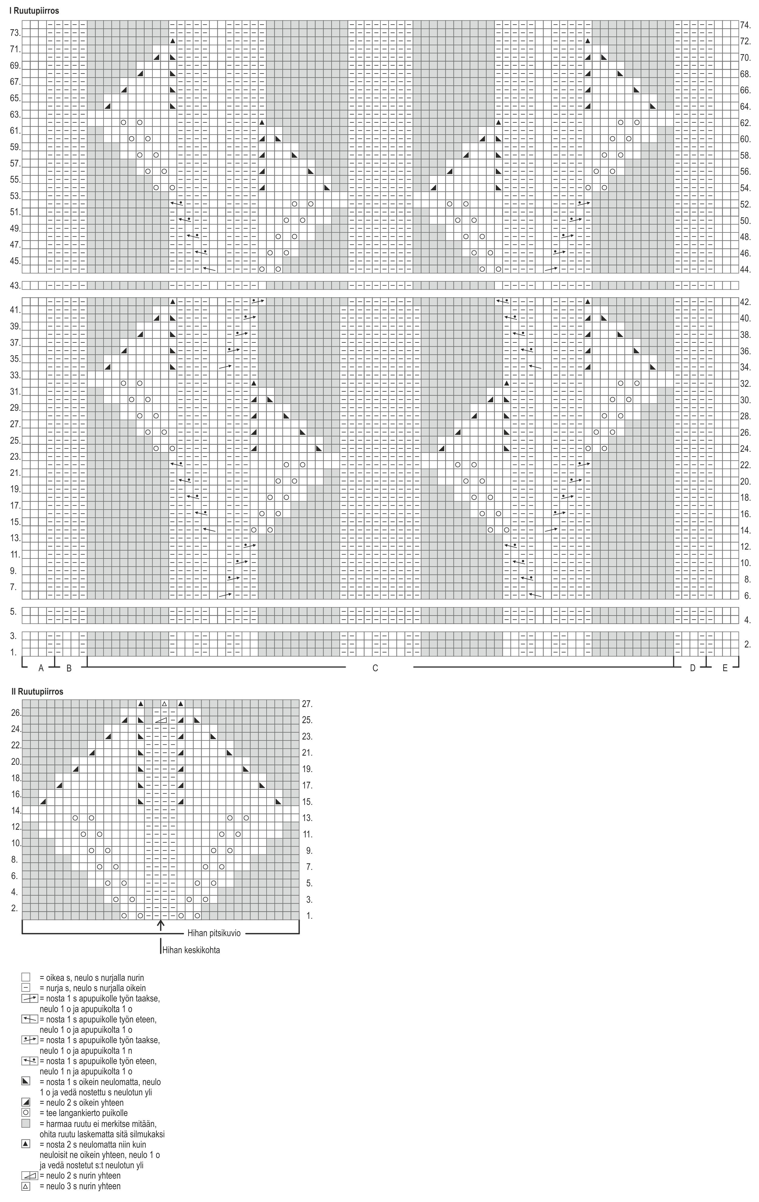 OBS! När du har stickat 8(10)16(16) varv avig slätstickning börja med spetsmönstret mitt i stycket från varv 1 i diagram II. Mitten har markerats med pil i nederkanten av diagrammet, räkna därifrån var mönstret ska börjas (bredden på mönstret på första varvet 6 m + 4 m). Sticka varv 1-27 i diagrammet vid spetsmönstret.