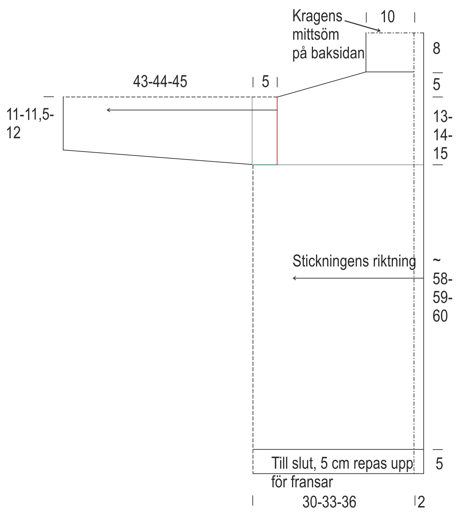 Plocka upp 30(32)35 m vid ärmhål (markerat med rött i mönstret) och sticka slätstickning.