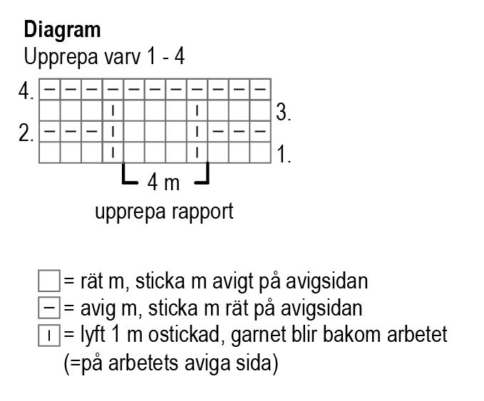 Lägg upp 71 m och sticka 3 varv rätstickning. Börja med strukturstickning på rätsidan från varv 1 i diagrammet: sticka 3 m från höger sida, upprepa sedan mönsterrapporten på 4 m 16 gånger och sticka ännu 4 m i vänster sida. Upprepa varv 1-4 i diagrammet tills arbetet mäter ca 49 cm och du har avslutat varv 3 i diagrammet.
