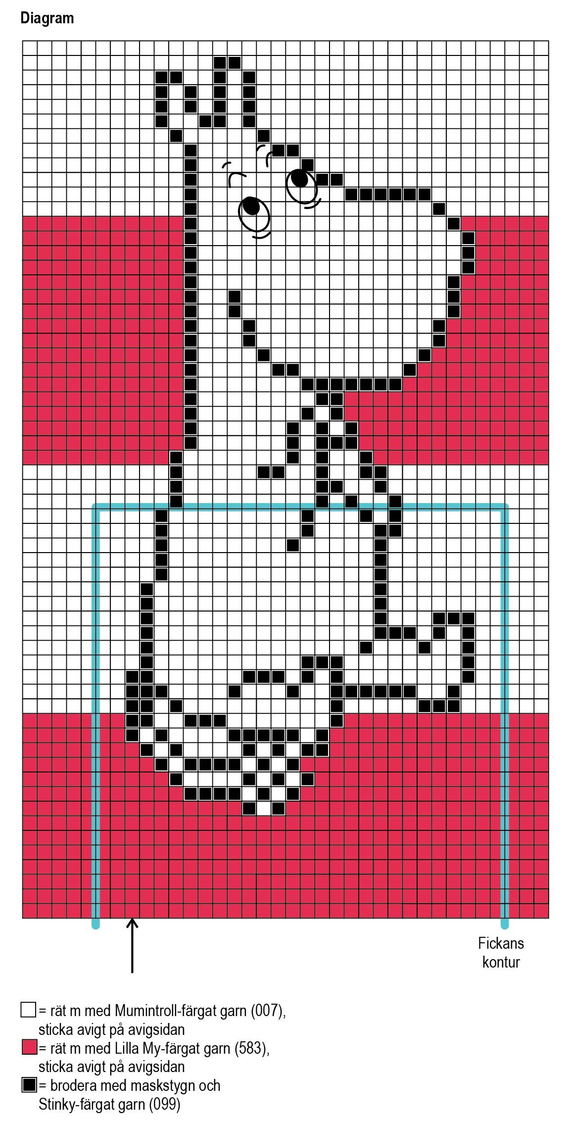 OBS! När det efter resåren är kvar 7 varv av den första randen av färgen Lilla My, sticka nederdelen av Mumin-figuren intarsia enligt diagrammet, konturerna broderas med färgen Stinky i efterhand genom att imitera maskor. Figurens vänstra sida, som hamnar ca 6(7)8(9)10(11) cm från styckets vänstra kant, har markerats med pil i diagrammet.