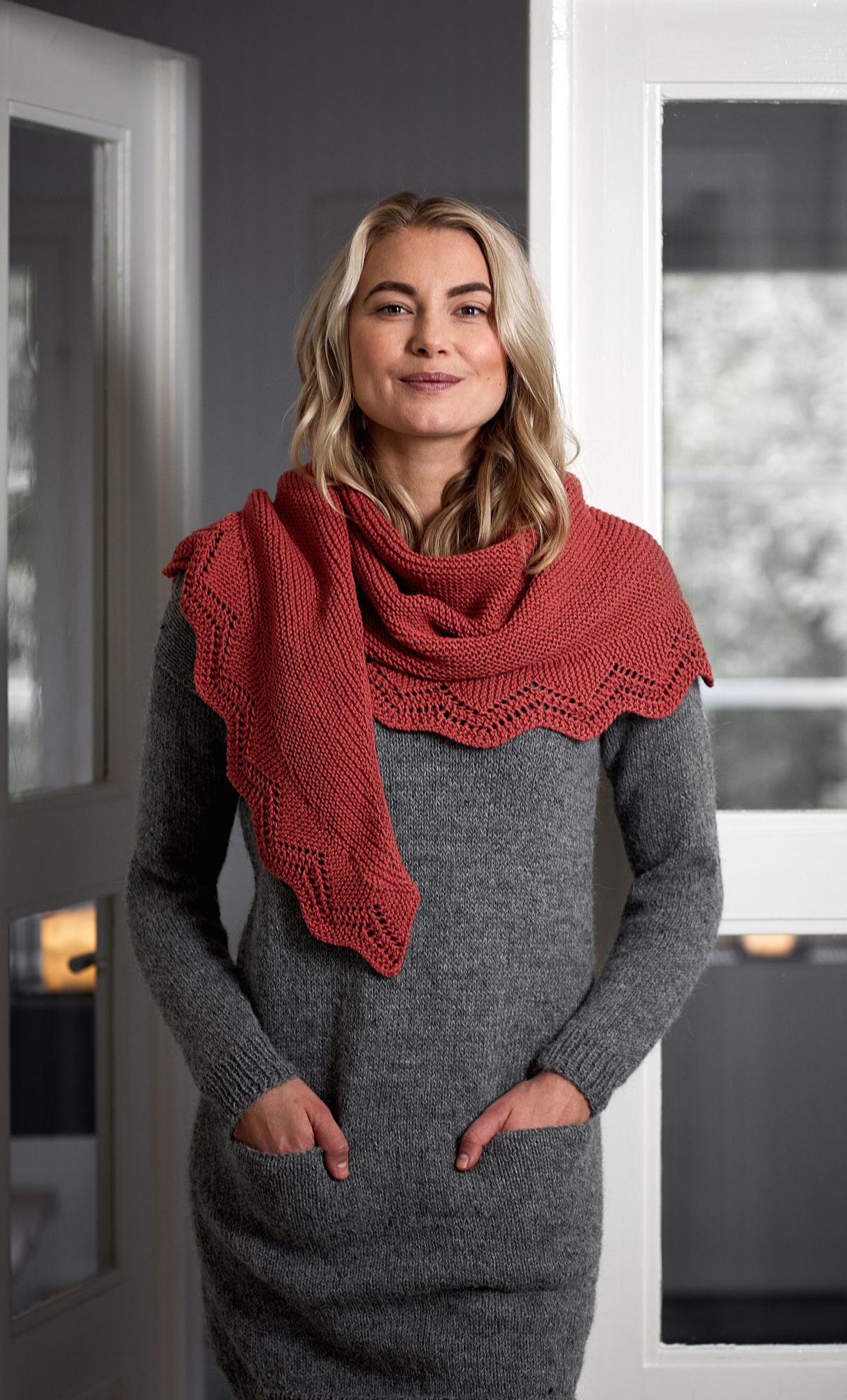 Kanten på den här rätstickade sjalen i Novita Wool Cotton garn är dekorerad med en spets som är gjord separat och sys på i efterhand.