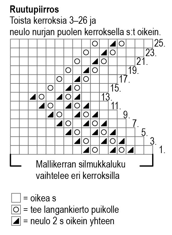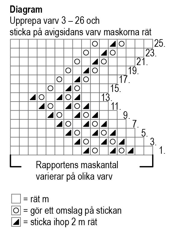 Kantspets: Lägg upp 17 m och sticka rm på avigsidan. Börja med spetsstickning från varv 1 i diagrammet och sticka alla m i diagrammet. OBS! Diagrammet visar bara varven på rätsidan, sticka alltid m och omslagen räta på avigsidan. Upprepa varv 3-26 tills spetsen är lika lång som själens rundade kant. Klipp inte av garnet.