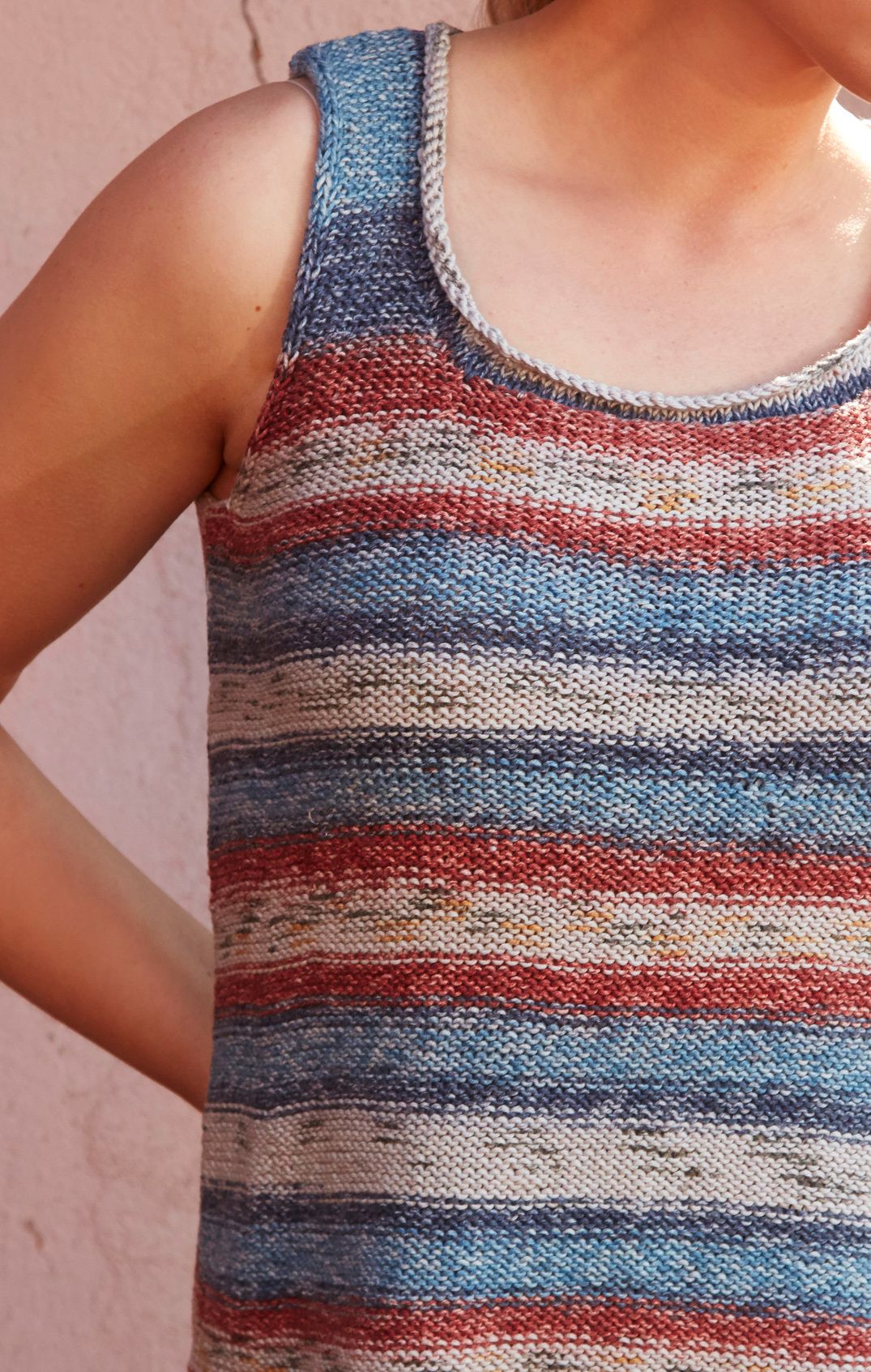 A-linjeformat linne i avigstickning. Om du vill kan du sy sömmarna så att så att den räta sidan blir slätstickad. Linnet kan också stickas i Novita Aamu garn.