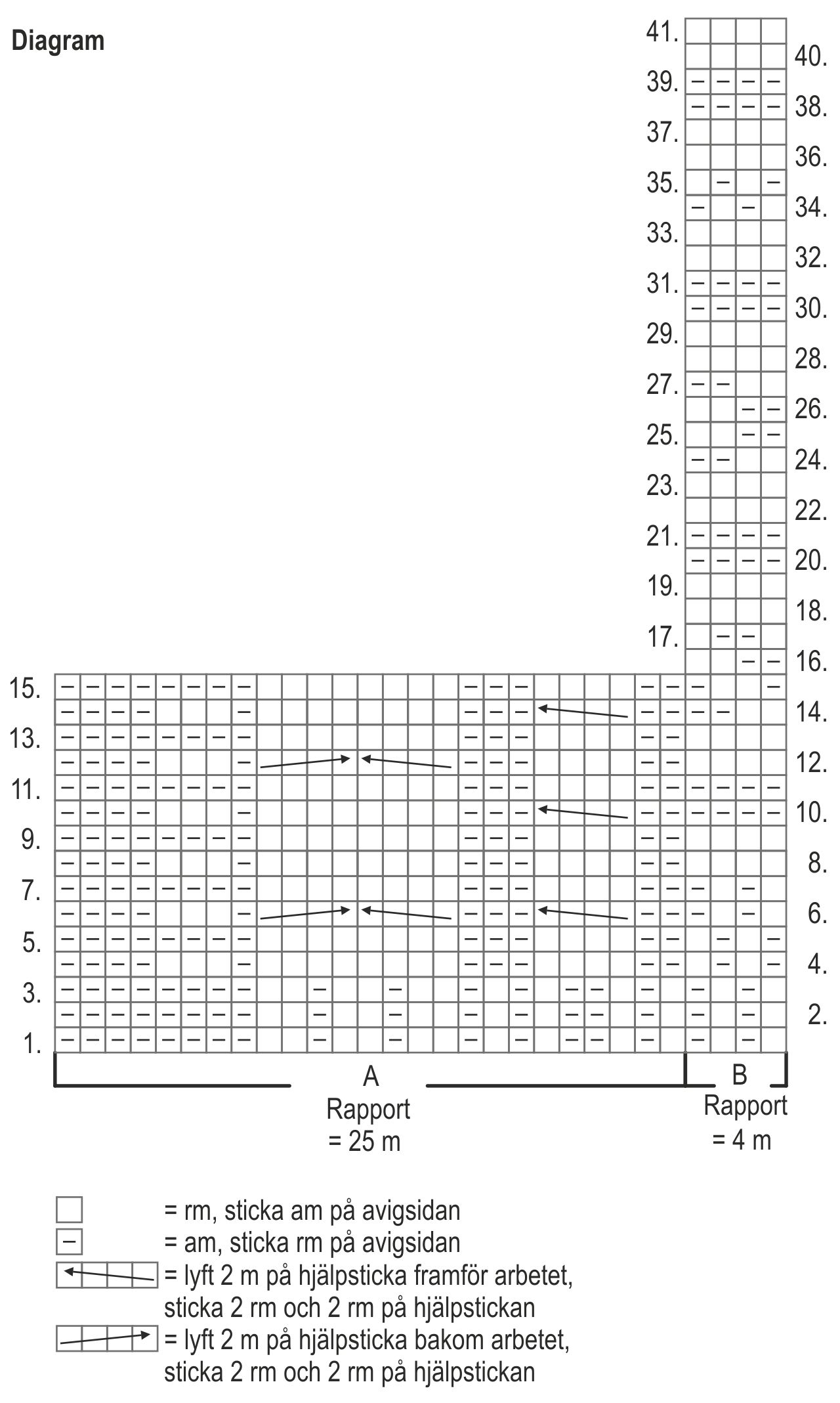 Lägg upp 51(55)59(63)69(73) m, börja med resårstickning på avigsidan från varv 1 i diagrammet enligt följande: sticka mönsterrapporten A (= 25 m) och upprepa sedan mönsterrapporten B (= 4 m) hela varvet ut så många gånger som det behövs. Upprepa varv 2-3 i diagrammet.