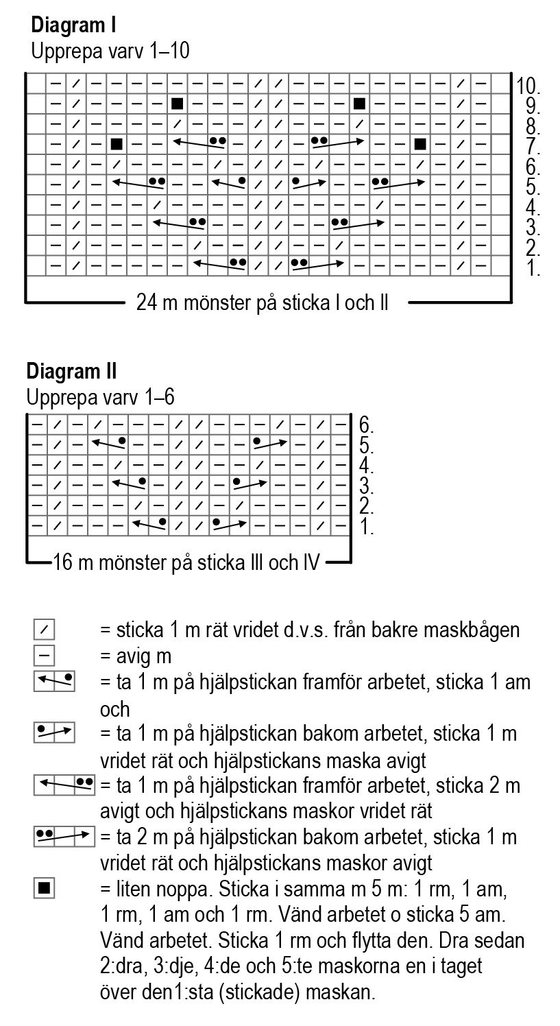 Börja med strukturstickning på sticka I och II från varv 1 i diagram I och sticka mönsterrapporten på 24 m. Sticka slätstickning på sticka III och IV. Sticka varv 2-10 i diagrammet. Upprepa sedan varv 1-10 i diagrammet.