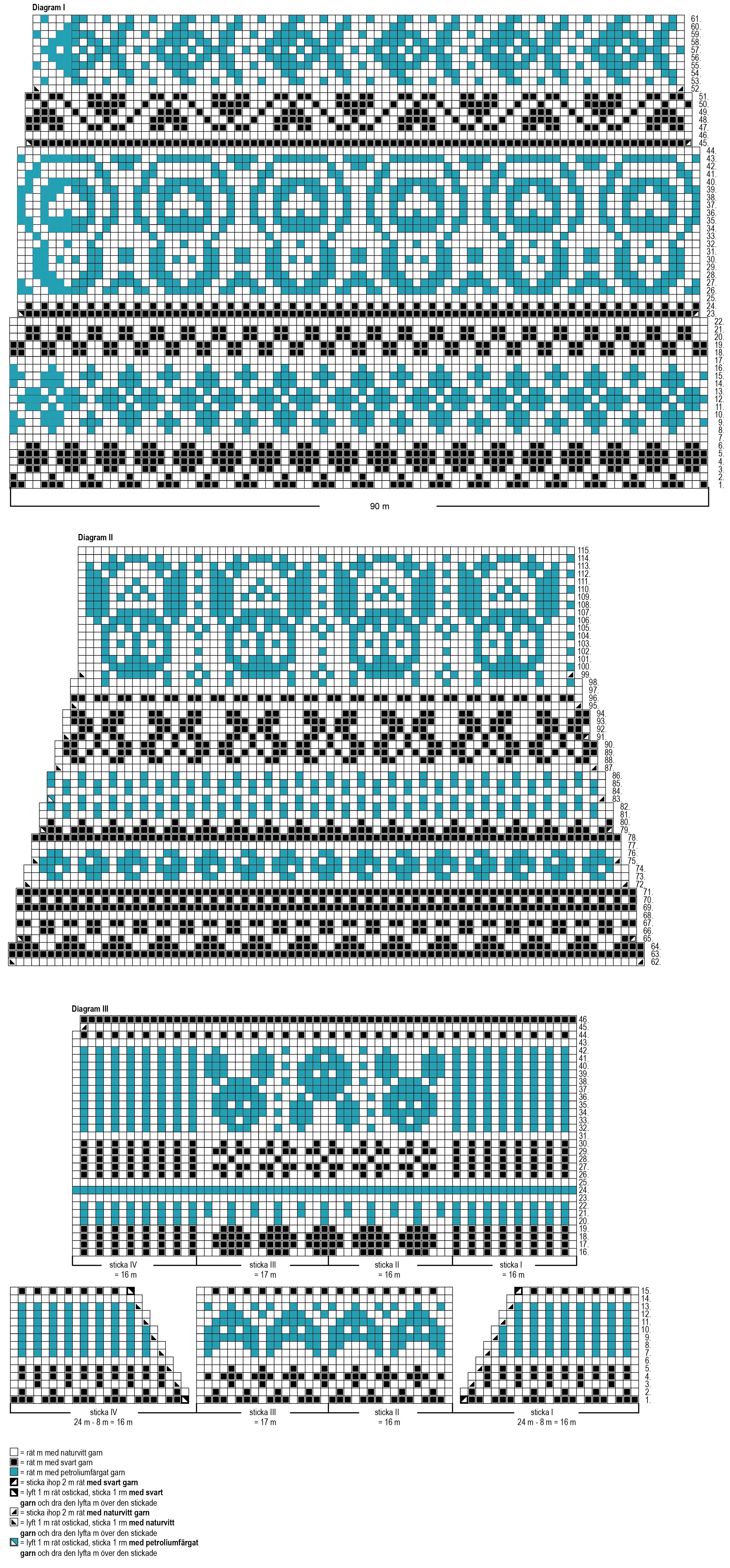 Börja med mönsterstickning runt från varv 1 i diagram I och sticka mönsterrapporten på 90 m. Sticka sedan varv 2-61 i diagram I och ännu varv 62-115 i diagram II. På varv 23, 45, 52, 62, 65, 72, 75, 79, 83, 87, 91, 95 och 99 minskas alltid 1 m i början och slutet av varvet. OBS! Ändra fördelningen av m på varv 71 så att det finns 24 m på sticka I, 16 m på sticka II, 16 m på sticka III och 24 m på sticka IV.