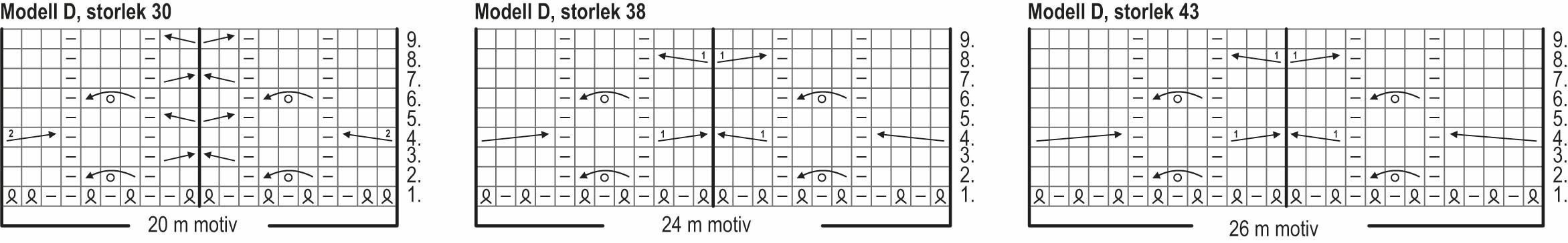 I storlek 43: Sticka och upprepa varv 1 i diagrammet för den valda modellen på sticka I–II. På sticka III sticka 1 am, *1 m vridet rätt, dvs. genom bakre maskbågen, 1 am* och upprepa *–* ännu 5 gånger. Sticka på sticka IV 1 am, *1 m vridet rätt, dvs. genom bakre maskbågen, 1 am*, upprepa *–* ännu 5 gånger och sticka 1 m vridet rätt, dvs. genom bakre maskbågen. Observera att det bakom sockan finns 2 aviga maskor bredvid varandra.