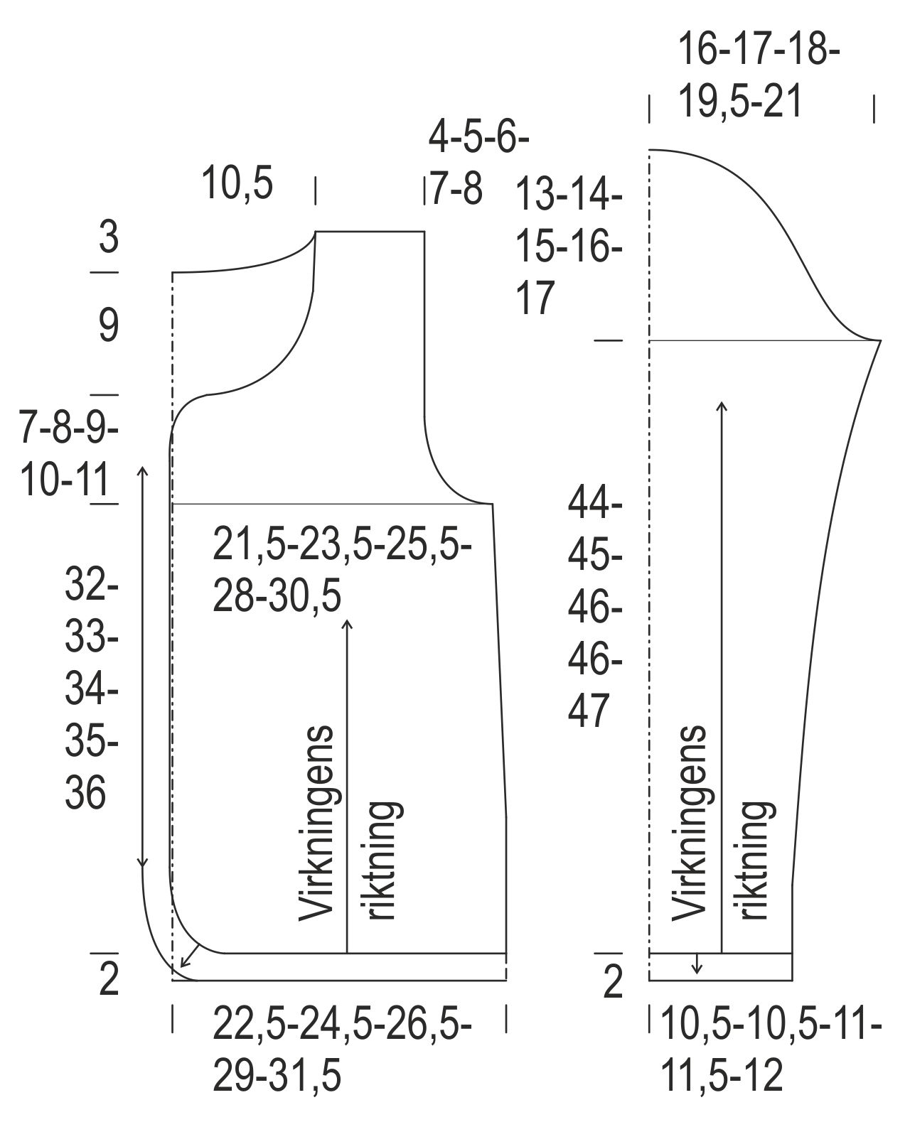 När arbetet mäter ca 32(33)34(35)36 cm gör minskningar för ärmhål i höger sida på samma sätt som i bakstycket = 41(44)45(49)52 m.