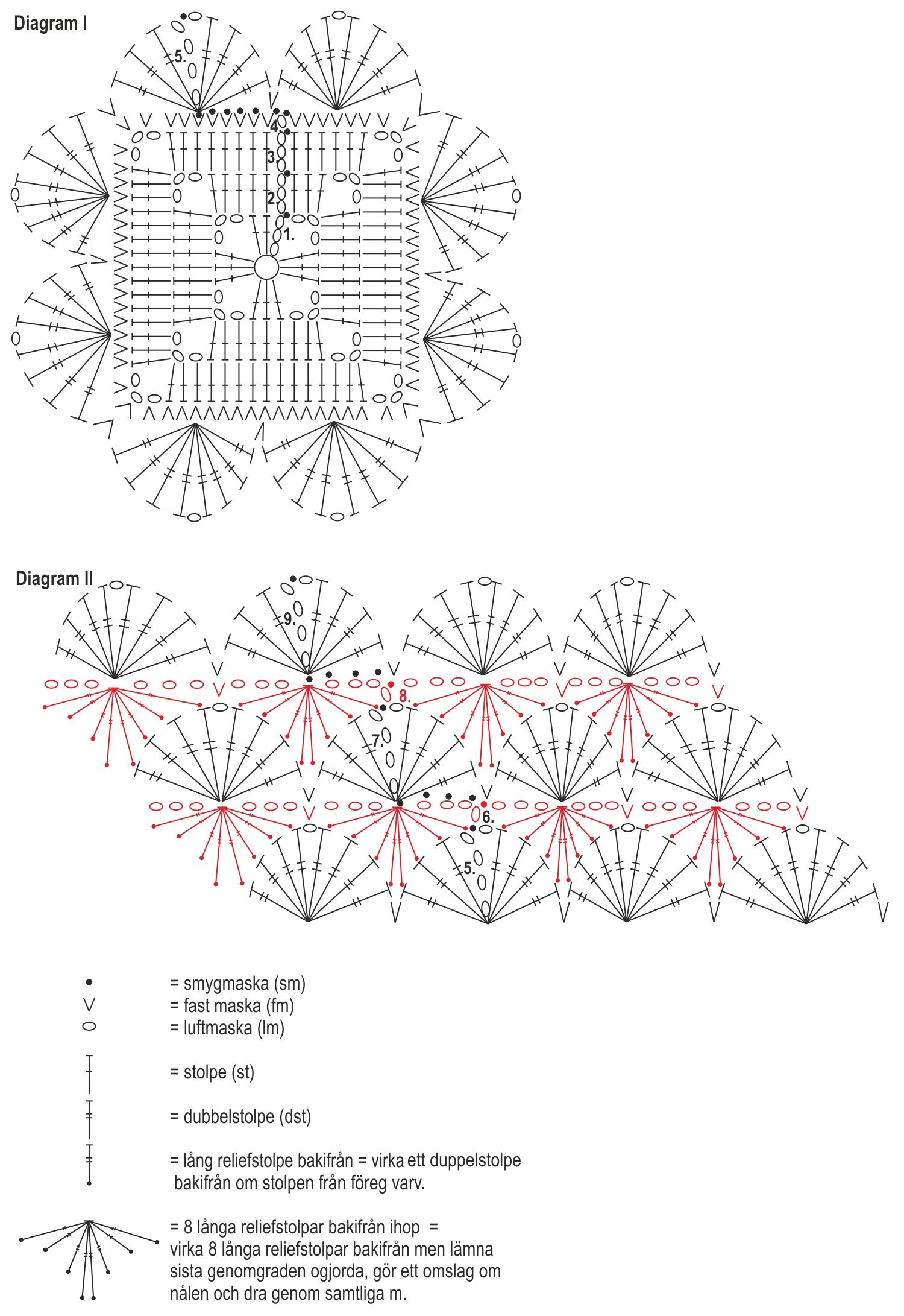 Virka varv 5 i diagram I. Fortsätt att virka från varv 6 i diagram II och virka varv 6-9. Virka ännu varv 6. På nästa varv virka 2 fm i varje lm-båge samt 1 fm i varje fm och stolpgrupp = 48 fm. Virka ännu 1 varv fm och klipp av garnet.