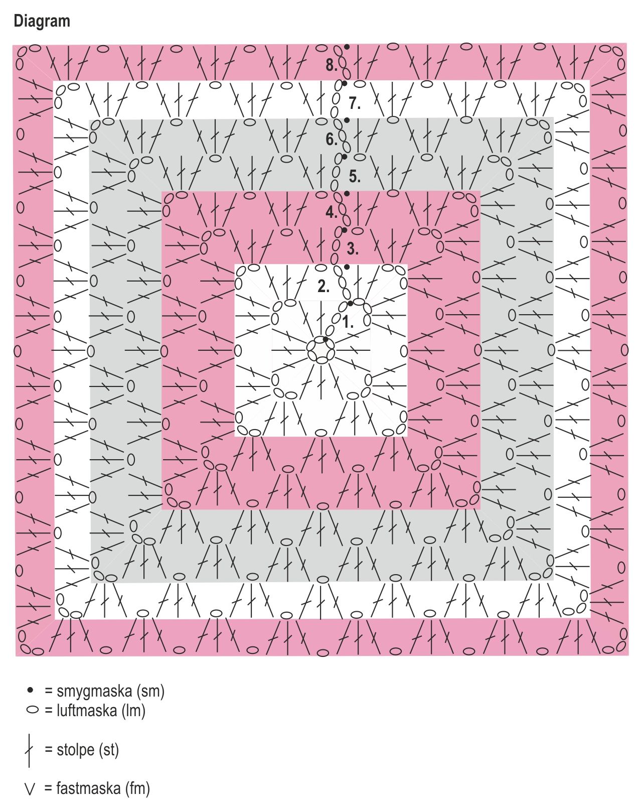 Fortsätt att virka varv 4 i diagrammet med det hallonfärgade garnet, varv 5 och 6 med det gråa, varv 7 med det naturvita och varv 8 med det hallonfärgade garnet. Klipp av garnet och fäst väl.